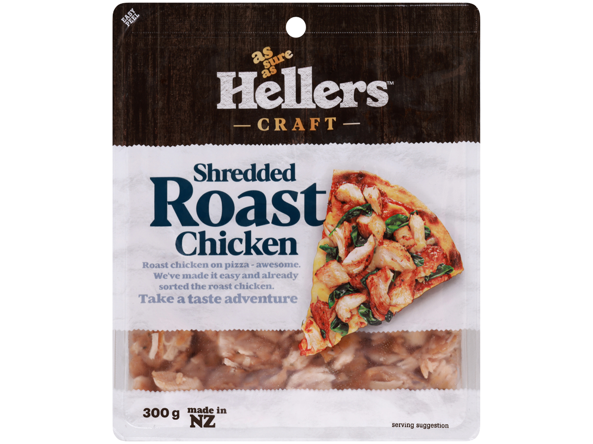 Shredded Roast Chicken ingredients Chicken (92%), Brine [Acidity Regulators (326, 262), Cure (Salt, Mineral Salts (451, 450, 452), Sugar, Thickeners (1412, 407a, 415), Stabiliser (508), Canola Oil), Nisin], Seasoning [Maltodextrin, Yeast Extract, Salt, Burnt Sugar Powder, Mineral Salt (508), Sugar, Vegetable Powder (Onion, Garlic), Spices (Including Pepper, Paprika), Tapioca Starch, Natural Flavour, Herbs, Vegetable Oil]. May Contain Soy Nutritional Facts Energy 490 kj Protein 20.0 g Gluten Nil detected Fat 1.8 g Saturated 0.6 g Carbohydrates 4.9 g Sugars 0.9 g Sodium 733 mg * Servings per 100g. All values are considered averages Made in NZ from local and imported ingredients. Products Deli Meats Shredded Roast Chicken Roast chicken on pizza – awesome. We’ve made it easy and already sorted with roast chicken. 300g Pack View Ingredients & Nutrition Shaved Smoked Chicken Shaved Roast Chicken Sliced Roast Chicken Shredded Roast Chicken Recipes Creamy Chicken Mushroom Turnovers View Recipe Coronation Chicken Baguettes View Recipe Cheesy Chicken Flatbreads View Recipe Paradise Chicken Lettuce Cups View Recipe